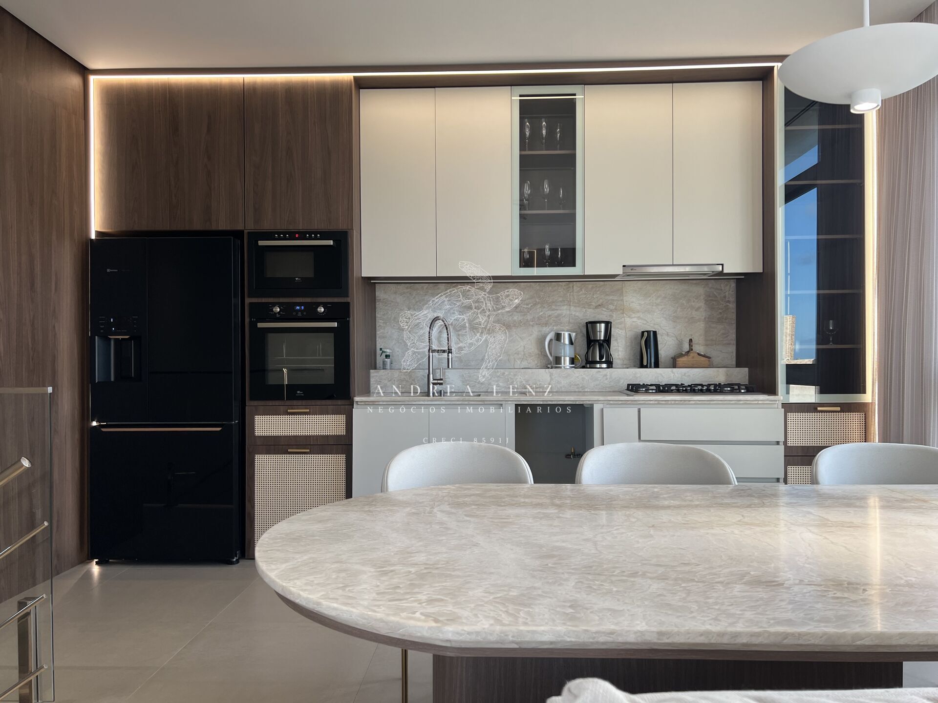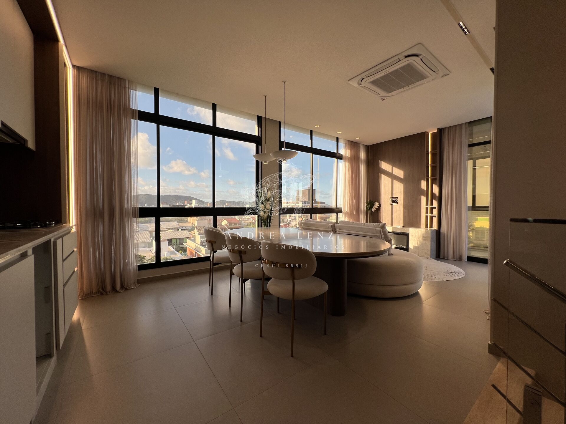 - Sala e cozinha integradas, em um ambiente muito bem iluminado