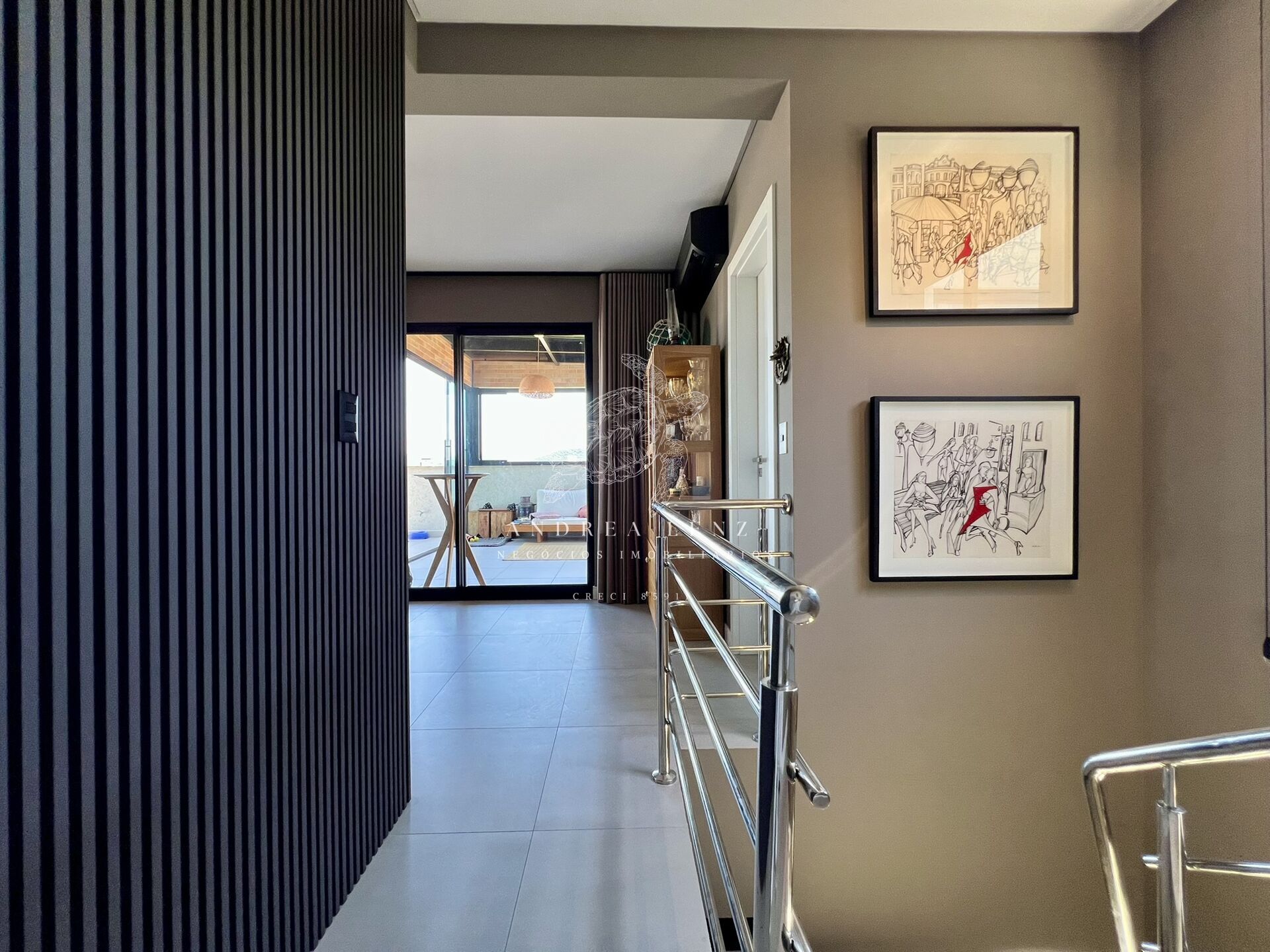 - Andar Superior: área social com sala e cozinha integradas, amplo terraço com churrasqueira e área de serviço independente