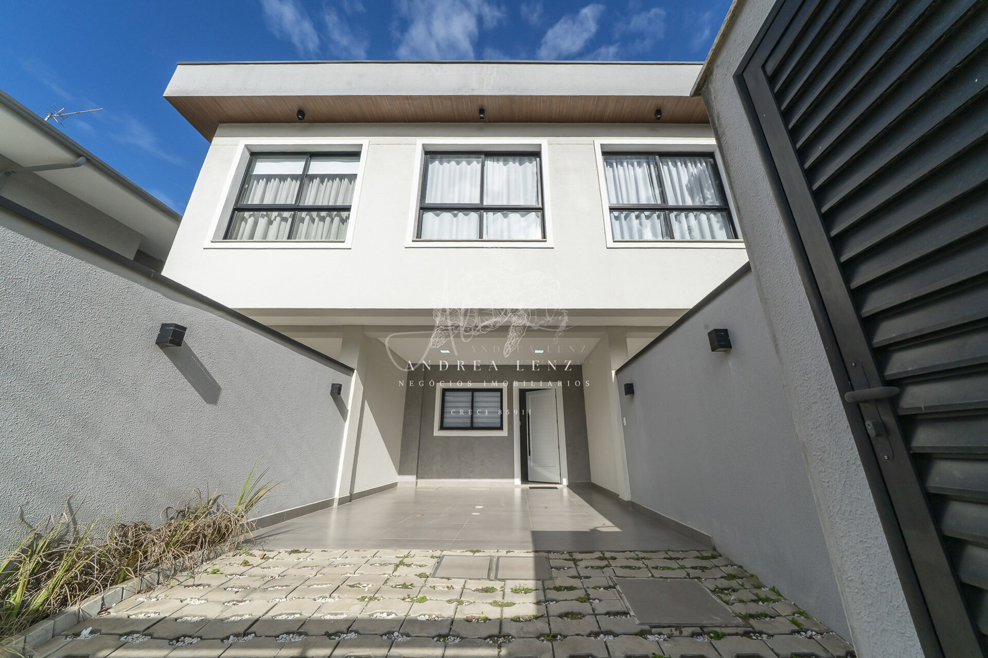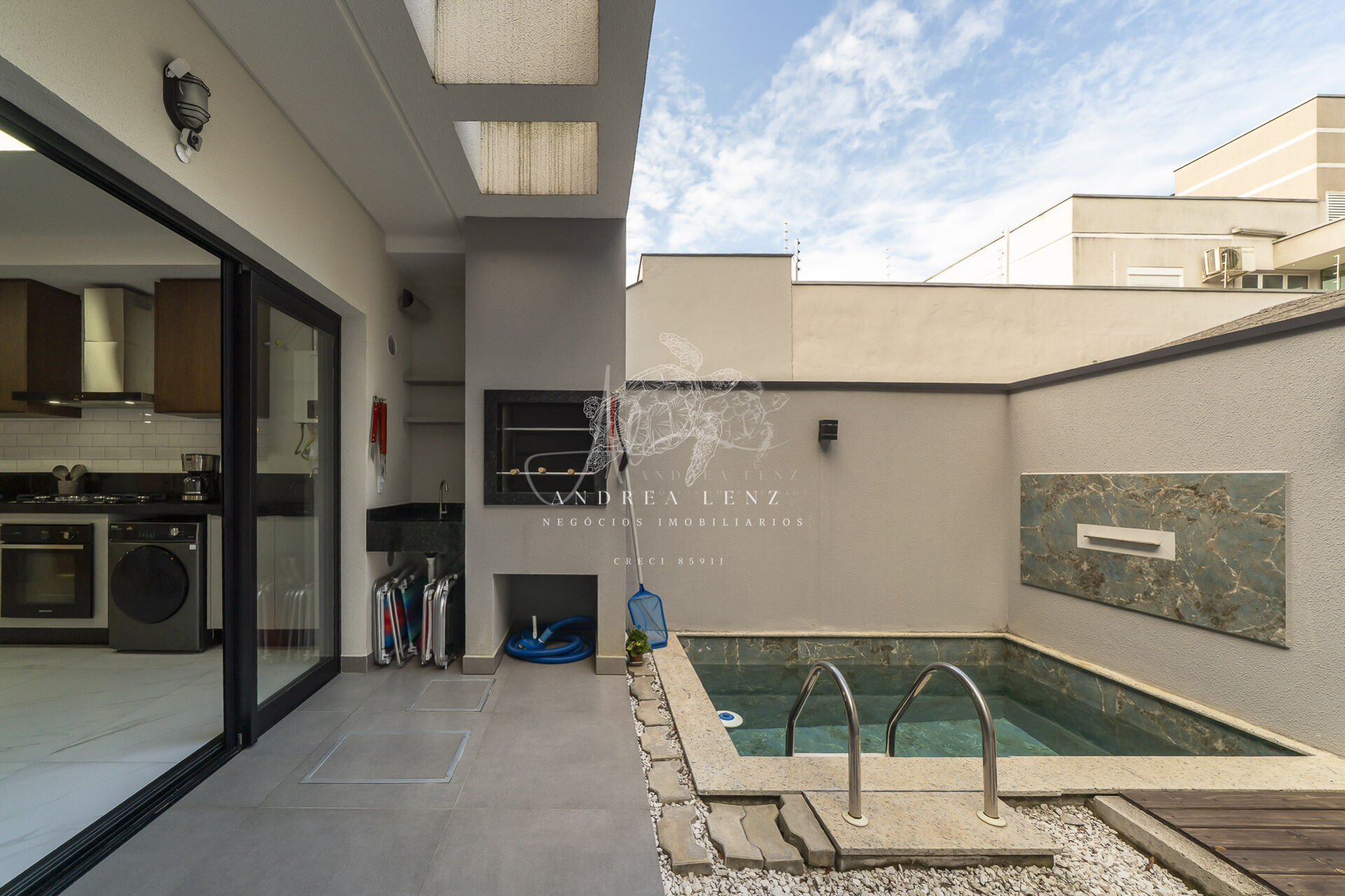 No andar térreo, encontram-se a sala de estar, sala de jantar, cozinha, área de serviço e um lavabo. Além disso, nos fundos, há uma ampla área de lazer com churrasqueira a carvão e piscina.