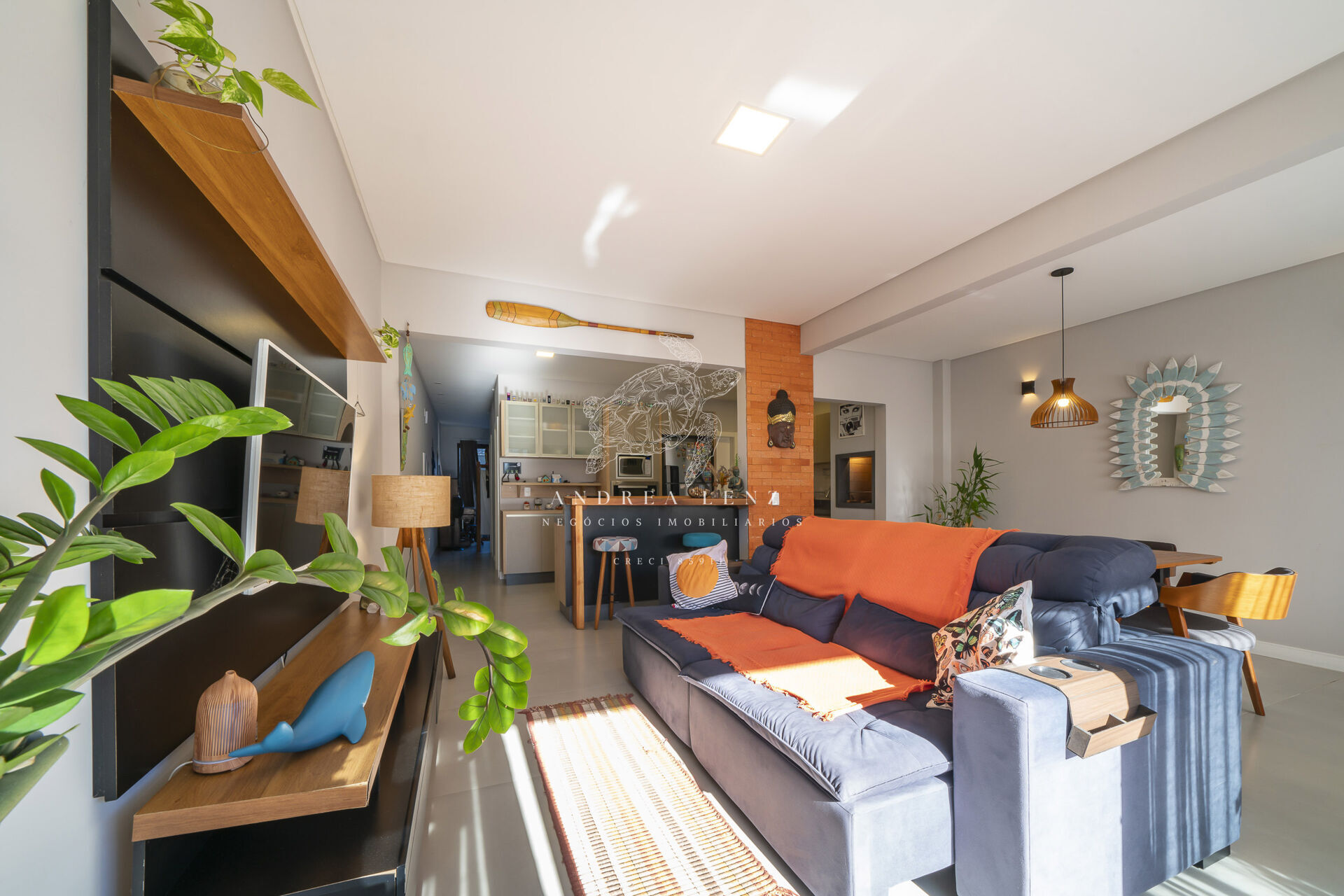 A sala de estar é espaçosa e bem iluminada, equipada com um sofá aconchegante e uma TV de tela plana, ideal para relaxar e se entreter. A cozinha é completa e funcional, com geladeira, fogão e micro-ondas, além de todos os utensílios para preparar refeições deliciosas. A mesa de jantar acomoda várias pessoas, perfeita para confraternizações e refeições em família.